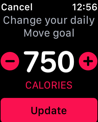 In order to change your daily Move goal, run the Activity app on the Apple Watch, and do a firm press anywhere on the screen. Then tap on Change Move Goal, and you will see the current Move goal (calories). You can adjust your daily Move goal by tapping on the + or – buttons, or by rotating the Digital Crown. Tap the Update button to set the new move goal, or tap Cancel to return to the Activity screen without changing your Move goal.