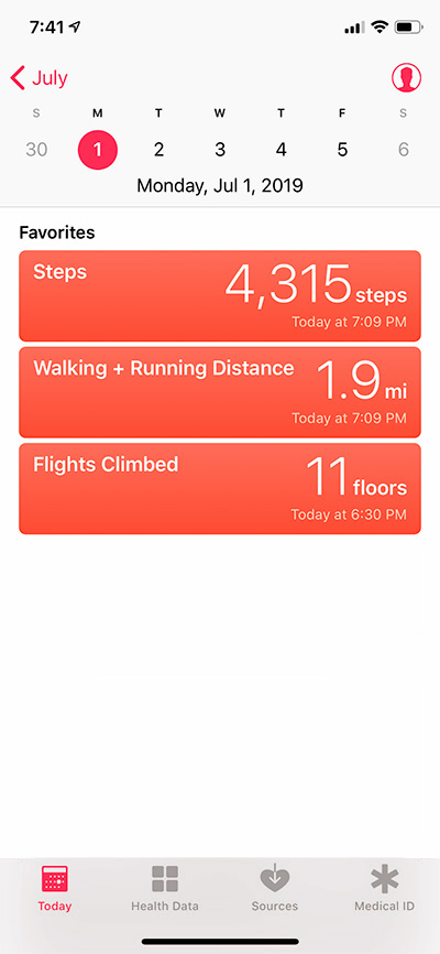 Run the Health app and tap Today at the bottom of the screen. You should see all of the activity that was recorded on your iPhone today. This should include Steps, Walking + Running Distance and Flights Climbed.