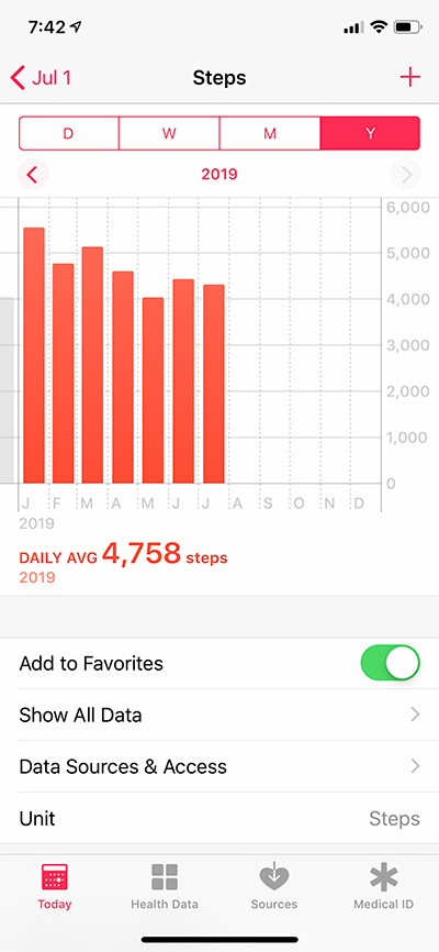 Tap on the D(ay), W(eek), M(onth), or Y(ear) button at the top of the screen to select the view. In Day view, you’ll see an hourly data chart and below the chart, your daily total. In Week and Month view, you’ll see a daily data chart, and in the Year view, you’ll see a monthly data chart. Below the chart in these views, you’ll see your daily average for the time period in the chart.