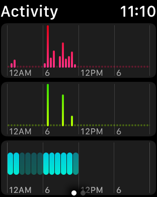 Below the progress circles, you will see three charts showing you the results for Move (red), Exercise (green) and Stand (blue) by the hour. The chart is for the current day, and goes from midnight to midnight.